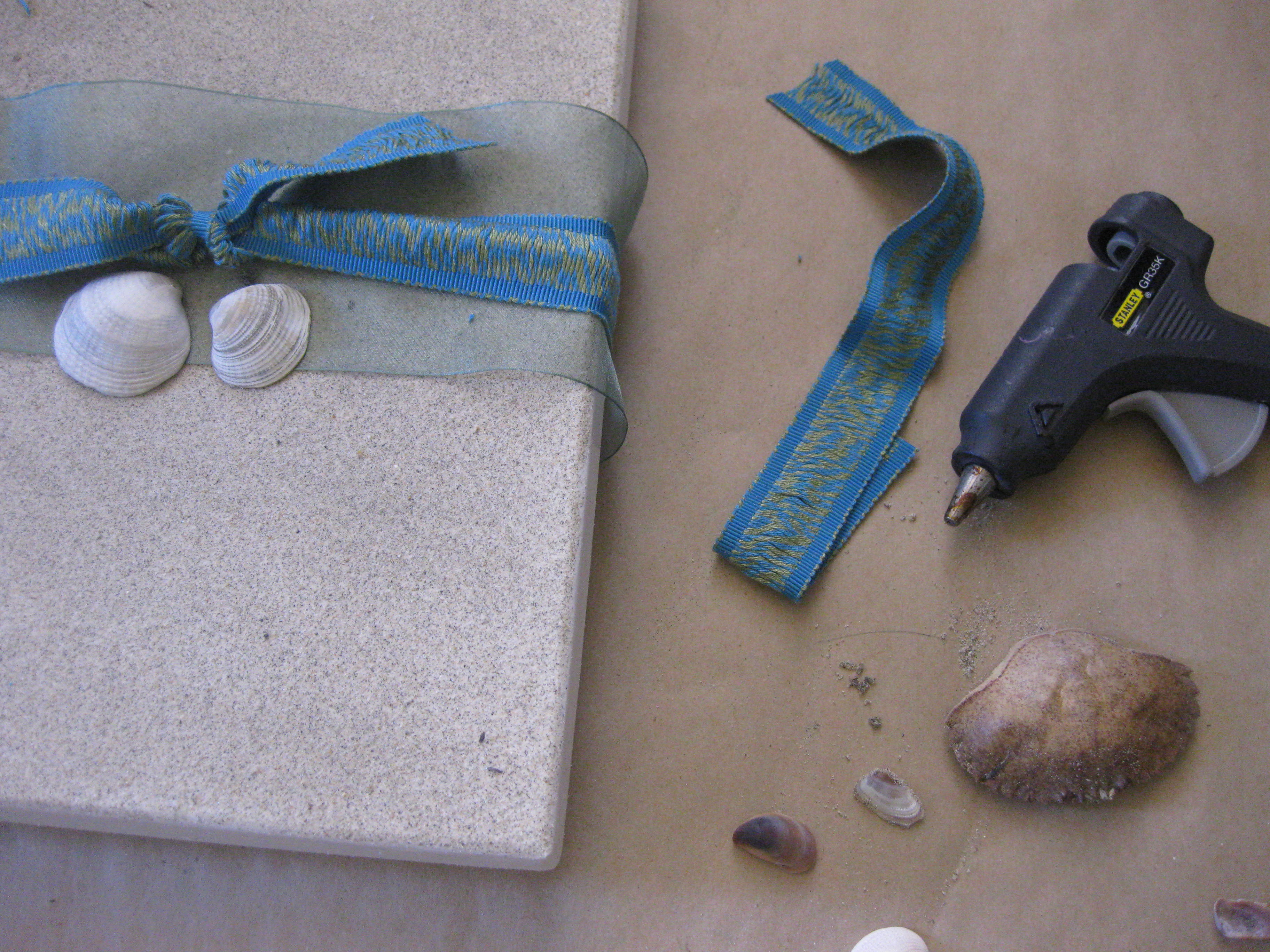Beach Theme Gift WrapI love small creative projects and wrapping presents is one of my favorites. This weekend I was inspired to wrap a baby gift in a beach theme, keeping in line with the motif of the baby’s room. Lucky for me, I live near the beach and had a small amount of sand and seashells on hand. I simply adhered to a box top with spray adhesive. Easy, breezy. I also had some organza ribbon in the perfect green that mimicked the ocean water. I tied that around the box along with some aqua trim and hot glued a few sea shells. Voila! A beautiful, personal wrapped gift.Sand on Box LidMokuba Organza RibbonHot Gluing ShellsBeach Theme Gift Wrap